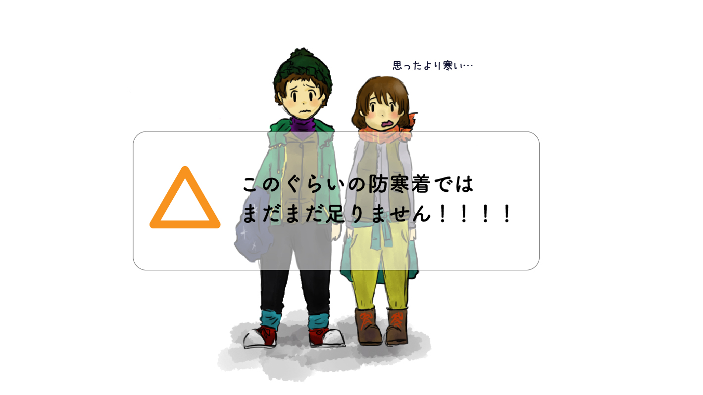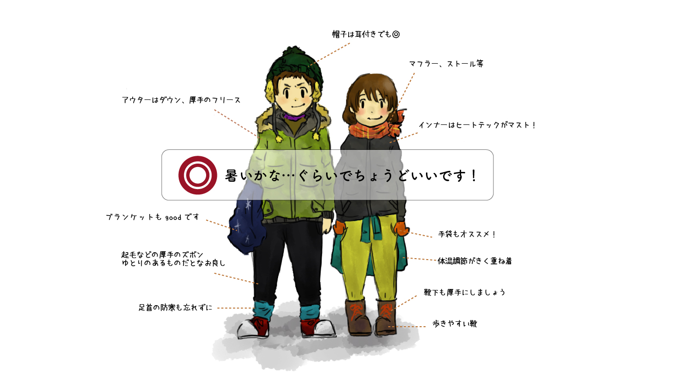 「厚手の靴下」、もしくは靴下の下に「タイツを重ね履き」することをお勧めします。手足が冷えやすい方は特にご注意ください。心配な方は足用カイロなどの持参をお勧めします。ヒートテックタイツのような防寒タイツもお勧めです。