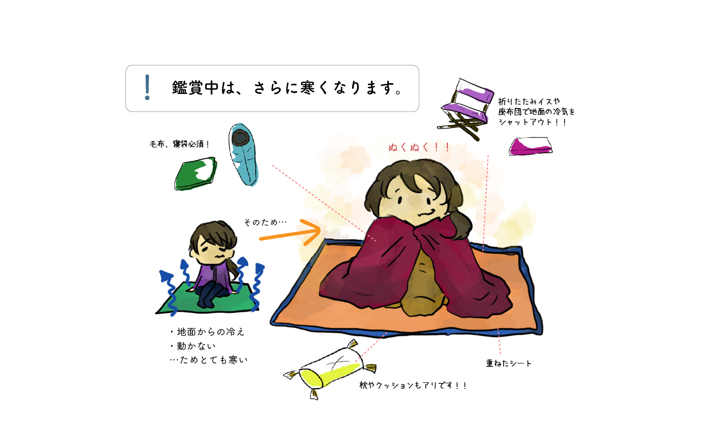「レジャーシート」をお持ちいただけると、会場内で座っていただきやすいかと思います。是非ご持参ください。土は夜間とても冷えます。お尻から冷えが伝わることのないよう、また、地面の硬さも和らいで、長時間座っていても疲れにくくなりますので、レジャーシートは複数枚持参して重ねて使って頂く、あるいは、大きめのものを2重・3重に折って重ねて使っていただけるとより過ごしやすくなると思われます。その他にも100円均一などで販売されております「アルミシート」などをレジャーシートの下に引いていただくのもお勧め致します。また、「簡易椅子」や「寝袋」の持ち込みも可能です。「枕」や「抱き枕」、「クッション」といったものを座って膝に乗せてご覧頂くのもお勧めです。首の負担を軽くし、仮眠もとりやすい「ネックピロー」もあると心地よい時間が過ごせるかもしれません。